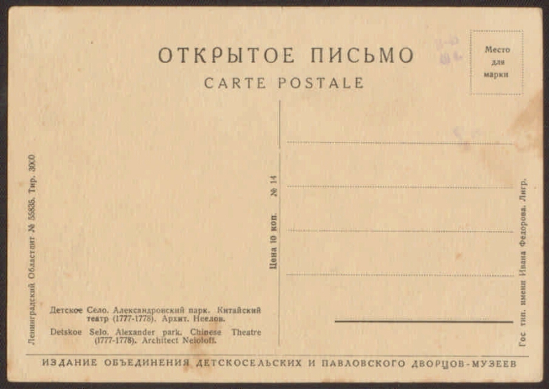Детское Село. Александровский парк. Китайский театр (1777-1778). Архит. Неелов [Изоматериал : электронный ресурс] = Detskoe Selo. Alexander park. Chinese Theatre (1777-1778). Architect Neioloff : [открытка]. - Электронные данные (2 файла : 2,66 МБ). - (Санкт-Петербург: Президентская библиотека имени Б. Н. Ельцина , 2014). - Режим доступа: интернет-портал Президентской библиотеки имени Б. Н. Ельцина. Заглавие с экрана. На оборотной стороне номер "№ 14". Предположительно открытка из серии . Электронная репродукция открытого письма: Детское Село. Александровский парк. Китайский театр (1777-1778). Архит. Неелов [Изоматериал] = Detskoe Selo. Alexander park. Chinese Theatre (1777-1778). Architect Neioloff. Издание Объединения Детскосельских и Павловского дворцов-музеев, [между 1925 и 1929] (Лнгр. : Гос. тип. имени Ивана Федорова). 1 открытка : фотомеханическая печать. № 55835. 10 коп. Тираж 3000 экз. Местонахождение: Детский музей открытки, Санкт-Петербург. Копирование пользователями не разрешается