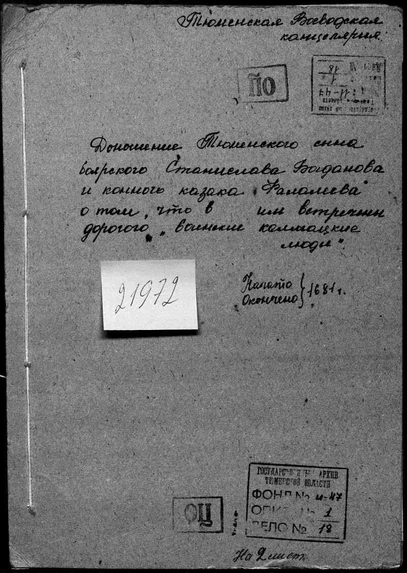 Доношение тюменского сына боярского Станислава Богданова и конного казака Фалалеева о том, что в ... им встречены дорогою "воинские калмыцкие люди" [Дело]. - 1681. - 2 л.. - (Фонд Тюменская воеводская канцелярия. Опись № 1). - Рукописный текст, чернила. 1681 года мая 19 дня по указу великого государя царя и великого князя Федора Алексеевича всея Великия и белыя и малыя России самодержца и по памяти стольника и воеводы князя Андрея Афанасьевича Чаколовского, тюменский сын боярский Станислав Богдановский, конный казак Федька Ямсков, служилый татарин Учетко ездили с Тюмени в поле, встали на урочище на юге и во жилище едучи дорогою воинских самоедских людей и ... накрепко и всяких самоедских людей и сами не выдали тихо и смирно, а старую [память] взяли в призначном месте в березе и привед ... в город, а новую память положили в той же березе, где...