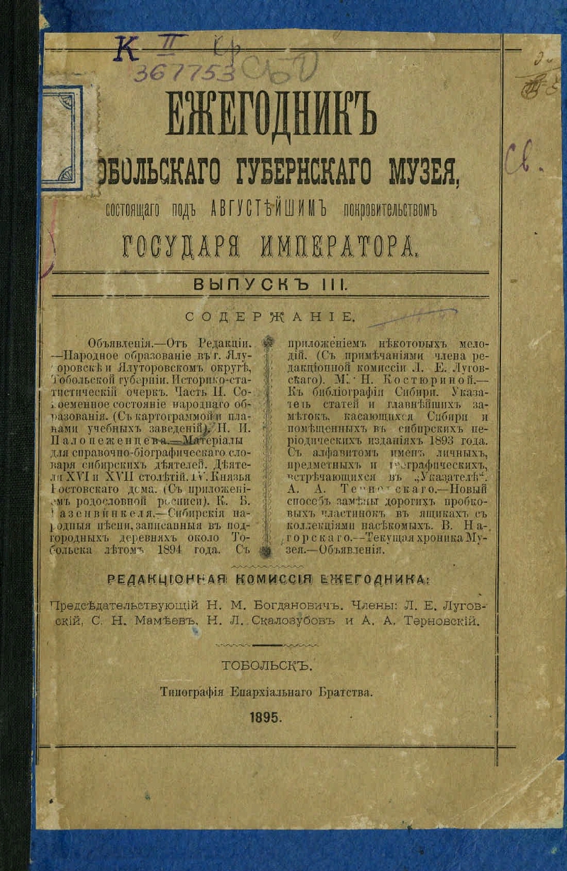 Вып. 3. - 1895. - [296] с. - Содерж.: Народное образование в городе Ялуторовске и Ялуторовском округе, Тобольской губернии: (ист.-стат. очерк). Ч. II. Современное состояние народного образования / П. Палопеженцев (с. 1-66); Материалы для справочно-биографического словаря сибирских деятелей. Деятели XVI и XVII столетий. IV Князья Ростовского дома / К. Б. Газенвинкель (с. 22); Сибирские народные песни, записанные в подгородных деревнях около Тобольска летом 1894 года / М. Н. Костюрина (с. 80); К библиографии Сибири / А. А. Терновский (с. 1-110); Текущая хроника музея. Октябрь - декабрь 1894 г. (с. 1-8); Новый способ замены дорогих пробковых пластинок в ящиках с коллекциями насекомых / В. Нагорский (с. 1-3)