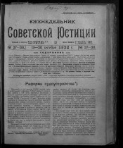 1922, № 37/38 (13-20 окт.). - 1922. - 48, [ХVI] с. - Содерж.: Реформа судоустройства / Крыленко. К реформе судоусройства РСФСР / Славин. Из записной книжки советского юриста / Андрес. Проект декрета о наследовании с точки зрения общих начал права / Вагин. К проекту декрета о наследовании / Рындзюнский. Обеспечение по Положению о государственных подрядах и поставках / Юновидов. Два слова о судебной квалификации работников народного суда / Одинцов. О перебросках / Лаптев. Обзор советского законодательства за время с 21 сентября по 4 октября 1922 г. / Брагинский. Нужны специальные жилищные камеры народного суда / Егоров. Проект Гражданского Процессуального Кодекса. Открытие деятельности Московской коллегии защитников. В Обществе работников советского права. В Московской прокуратуре. Официальное приложение: Декреты ВЦИК и СНК. Циркуляры Наркомюста. Циркуляры Верховного Трибунала и др.
