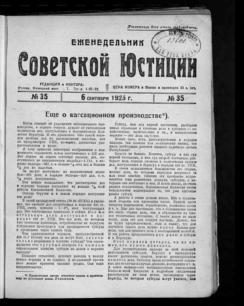1923, № 35 (6 сент.). - 1923. - С. [791]-816, [2]. - Содерж.: Еще о кассационном призводстве / Н. Нехамкин. Допускает ли наследование декрет 22 мая 1922 г. / И. Вольман. Ответ И. Вольману / А. Гойхбарг. Должны ли применяться поправочные коэффициенты 0,3 и 0,7 к долгосрочным арендным договорам / И. Кобленц. Отвод состава суда по Граж. Проц. Кодексу / Мустафа. Применение мер социальной защиты / И. Сапгир. По вопросу об увольнении в бессрочный отпуск военнослужащих, состоящих под судом или следствием / И. Ш. Обзор сов. законодательства за время с 24 по 31 августа 1923 г. / М. Брагинский и др.