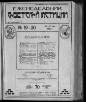 1924, № 19/20 (10-17 мая). - 1924. - С. [439]-482, [483-486], [2]. - Содерж.: Военные трибуналы и нарзаседатели / Як. Берман. К проекту Кодекса зак. о браке, семье и опеке / Г. Рындзюнский. О фирме предприятия / Хр. Бахчисарайцев. Право передоверия / С. Добрин. О повороте исполнения / Л. Фишман. По поводу статьи Л. Быховского "Порядок уничтожения последствий отмененного решения" / Г. Розенман. Наследственное право и выморочный двор / В. Лучанинов. Конфискация имущества по ст. ст. 205, 205-а, 205-б, 205-в Уголовного Кодекса / В. Малкис. Ст. ст. 88 и 172 Уг. Код. и судебная практика / М. Быков. Прокуратура при военных трибуналах / Ветлужский. Произвольные действия на местах / В. С. Деятельность Моск. судебно-медиц. экспертизы в 1923 г. / Н. Попов. Обзор сов. законодательства за время с 25 апреля по 5 мая 194 г. / М. Брагинский и др.
