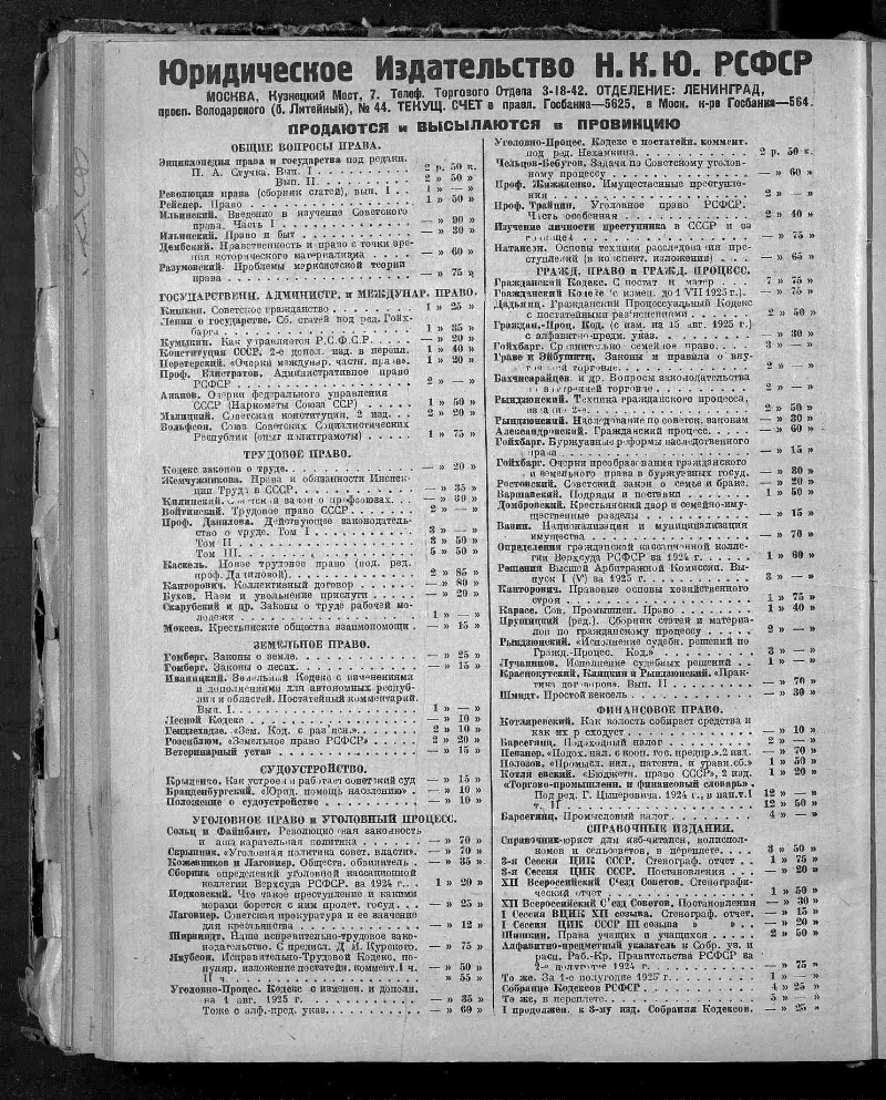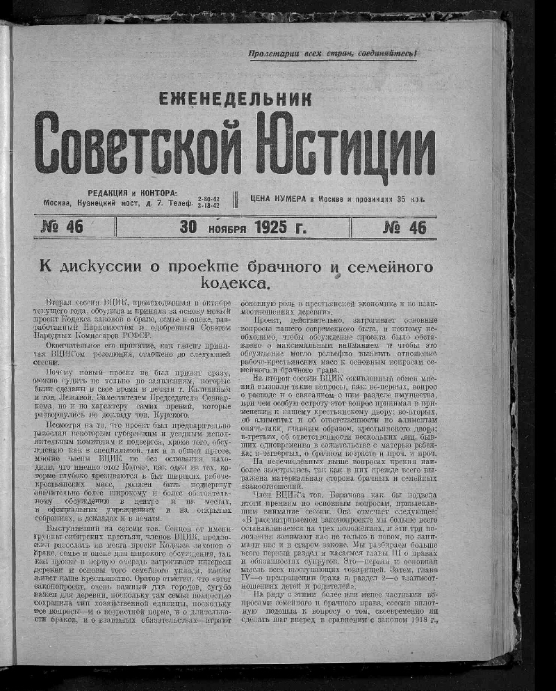 1925, № 46 (30 нояб.). - 1925. - С. [1411]-1442, [2]. - Содерж.: К дискуссии о проекте брачного и семейного кодекса / Я. Брандербургский. Действующие правила об акционерных обществах с участием госкапитала / Х. Бахчисарайцев. Съезд германских судей в Аусбурге / Е. Кельман. Приостанавливает ли подача частной жалобы немедленное исполнение решений? / М. Герст. Надзор по гржд. Делам / Р. Полышев. Некоторые итоги новой подсудности народных судов / Драгунский. Своевременно ли новое расширение подсудности нарсудов? / В. Петров. Изучение правовой жизни деревни / И. Лерман. Обзор сов. законодательства за время с 16 по 22 ноября 1925 г. / М. Брагинский и др.