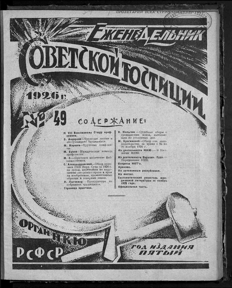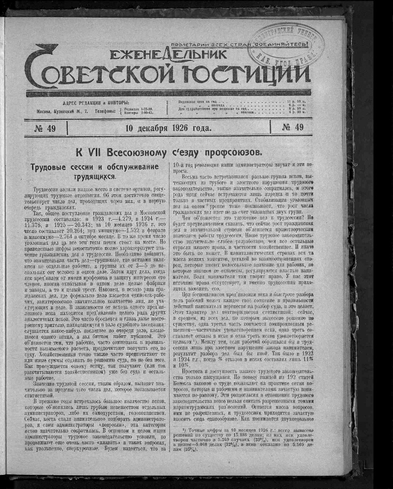 1926, № 49 (10 декабря). - 1926. - С. 1369-1392. - Содерж.: К VII Всесоюзному Съезду профсоюзов. Страница практика. Из деятельности НКЮ. Из деятельности Верховного Суда. Вопросы НОТа, и другие материалы. - Систематический указатель юридической литературы за ноябрь 1926 года: с. 1388-1390. - 16500 экз.