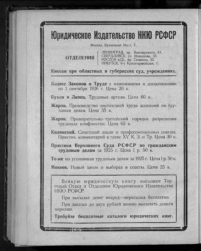 Еженедельник советской юстиции. - Москва : Юридическое издательство НКЮ РСФСР, 1922-1929. - Главными редакторами "Еженедельника Советской Юстиции" были Н. Черлюнчакевич (1922 год), А. Лисицин (1922–1923 гг.), Н. Крыленко (1923–1925 гг.), Д. Курский (1926–1928 гг.), Я. Бранденбургский (1928–1929 гг.), П. Стучка (1929 год). С 1928 года "Еженедельник Советской Юстиции" выходит три раза в месяц с приложением "Судебная практика РСФСР" под редакцией Председателя Верховного Суда РСФСР П. Стучки. Загл.: 1930-1993 - Советская юстиция, 1994-2001 - Российская юстиция