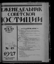 Еженедельник советской юстиции. - Москва : Юридическое издательство НКЮ РСФСР, 1922-1929. - Главными редакторами "Еженедельника Советской Юстиции" были Н. Черлюнчакевич (1922 год), А. Лисицин (1922–1923 гг.), Н. Крыленко (1923–1925 гг.), Д. Курский (1926–1928 гг.), Я. Бранденбургский (1928–1929 гг.), П. Стучка (1929 год). С 1928 года "Еженедельник Советской Юстиции" выходит три раза в месяц с приложением "Судебная практика РСФСР" под редакцией Председателя Верховного Суда РСФСР П. Стучки. Загл.: 1930-1993 - Советская юстиция, 1994-2001 - Российская юстиция