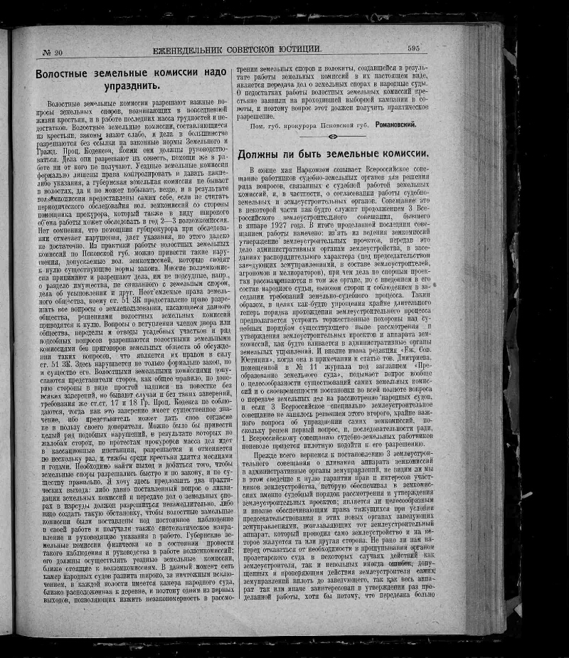 1927, № 20 (25 мая). - 1927. - С. 593-624 : табл. - Содерж.: За ликвидацию земельных комиссий / А. Стельмахович. Волостные земельные комиссии надо упразднить / Романовский. Должны ли быть земельные комиссии / Хаданов. Закон о сельских общественных собраниях (сходах) / Мокеев. Прокуратура и борьба за снижение цен / Н. Лаговиер, и другие материалы. - 17000 экз.