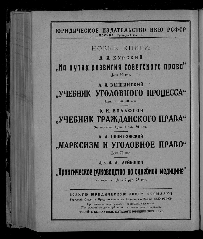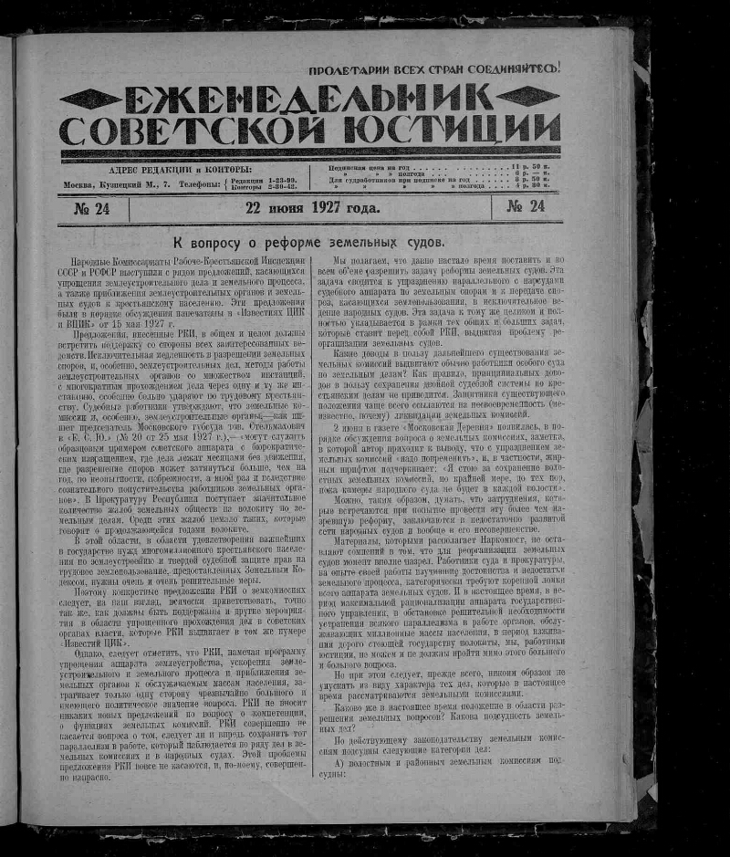Еженедельник советской юстиции. - Москва : Юридическое издательство НКЮ РСФСР, 1922-1929. - Главными редакторами "Еженедельника Советской Юстиции" были Н. Черлюнчакевич (1922 год), А. Лисицин (1922–1923 гг.), Н. Крыленко (1923–1925 гг.), Д. Курский (1926–1928 гг.), Я. Бранденбургский (1928–1929 гг.), П. Стучка (1929 год). С 1928 года "Еженедельник Советской Юстиции" выходит три раза в месяц с приложением "Судебная практика РСФСР" под редакцией Председателя Верховного Суда РСФСР П. Стучки. Загл.: 1930-1993 - Советская юстиция, 1994-2001 - Российская юстиция