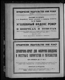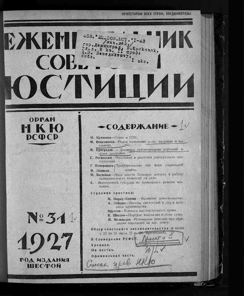 1927, № 31 (10 августа). - 1927. - С. 945-976. - Содерж.: Новое в ГПК / Н. Кумыкин. Новое положение о государственных подрядах и поставках / М. Венецианов. Договоры купли-продажи строений и права застройки / М. Приградов. Идеальная и реальная совокупность преступлений / Г. Рогинский. Предупреждение как мера социальной защиты / Г. Померанцев, М. Левиков, и другие материалы. - Указатель циркуляров НКЮ и Верхсуда, разъяснений Пленума Верхсуда за 1 полугодие 1927 г. (1 января - 30 июня 1927 г.): с. 974-976. - Библиография в подстрочных примечаниях. - 17000 экз.