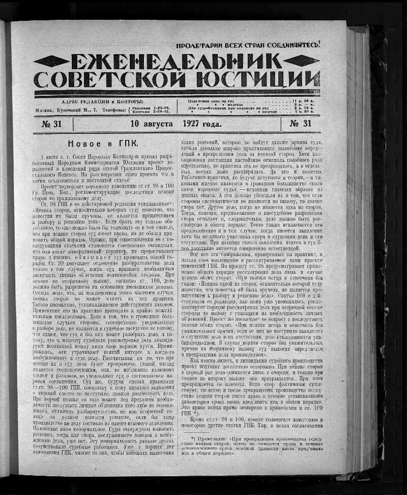 Еженедельник советской юстиции. - Москва : Юридическое издательство НКЮ РСФСР, 1922-1929. - Главными редакторами "Еженедельника Советской Юстиции" были Н. Черлюнчакевич (1922 год), А. Лисицин (1922–1923 гг.), Н. Крыленко (1923–1925 гг.), Д. Курский (1926–1928 гг.), Я. Бранденбургский (1928–1929 гг.), П. Стучка (1929 год). С 1928 года "Еженедельник Советской Юстиции" выходит три раза в месяц с приложением "Судебная практика РСФСР" под редакцией Председателя Верховного Суда РСФСР П. Стучки. Загл.: 1930-1993 - Советская юстиция, 1994-2001 - Российская юстиция