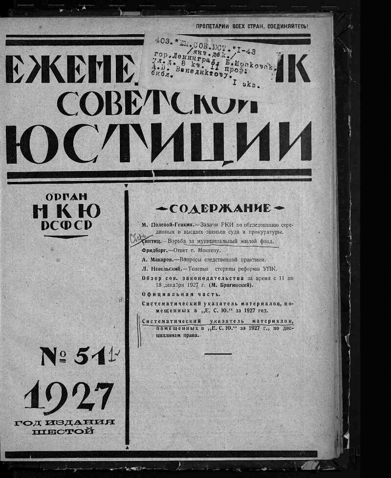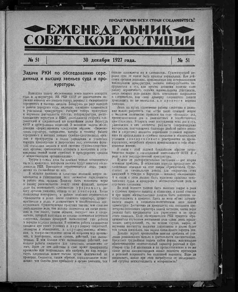 1927, № 51 (30 декабря). - 1927. - С. 1585-1600. - Содерж.: Задачи РКИ по обследованию серединных и высших звеньев суда и прокуратуры / М. Полевой-Генкин. Борьба за муниципальный жилой фонд / Сиптиц. Ответ т. Мокееву / Фридберг. Вопросы следственной практики / А. Макаров. Теневые стороны реформы УПК / Л. Невельский, и другие материалы. - 16000 экз.