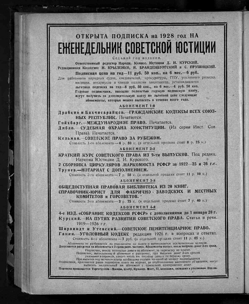 Еженедельник советской юстиции. - Москва : Юридическое издательство НКЮ РСФСР, 1922-1929. - Главными редакторами "Еженедельника Советской Юстиции" были Н. Черлюнчакевич (1922 год), А. Лисицин (1922–1923 гг.), Н. Крыленко (1923–1925 гг.), Д. Курский (1926–1928 гг.), Я. Бранденбургский (1928–1929 гг.), П. Стучка (1929 год). С 1928 года "Еженедельник Советской Юстиции" выходит три раза в месяц с приложением "Судебная практика РСФСР" под редакцией Председателя Верховного Суда РСФСР П. Стучки. Загл.: 1930-1993 - Советская юстиция, 1994-2001 - Российская юстиция