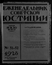 1928, № 51/52 (31 декабря). - 1928. - С. 1269-1290, XVII : табл. - Содерж.: К десятилетию военных трибуналов / В. Ульрих. Бытовые преступления в ЗСФСР / Ф. Мельников. Нужно сделать выводы / К. Дигуров. Больше внимания работе судисполнителей / Д. Хлебников. Забытый фронт / Н. М-лев, и другие материалы. - Алфавитно-предметный указатель материалов, помещенных в "Еженедельнике советской юстиции" за 1928 г.: с. V-XVII. - Систематизированный указатель материалов, помещенных в "Еженедельнике советской юстиции" за 1928 г.: с. I-IV. - 15000 экз.