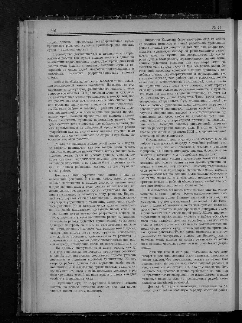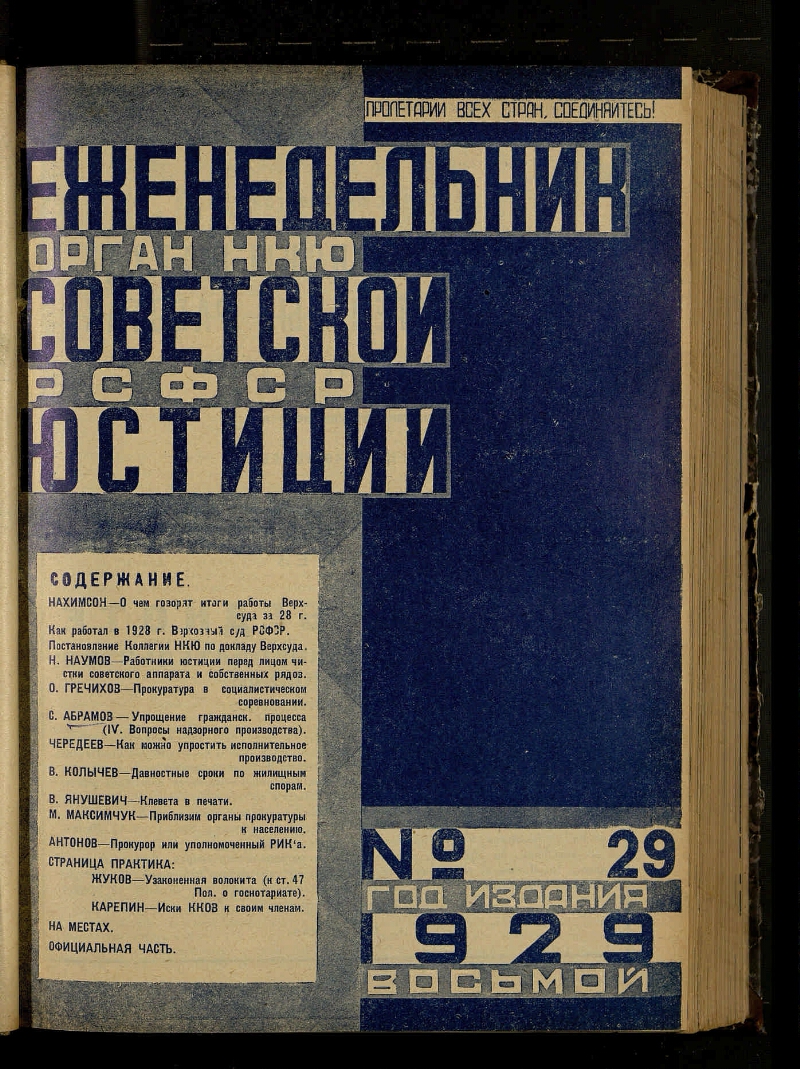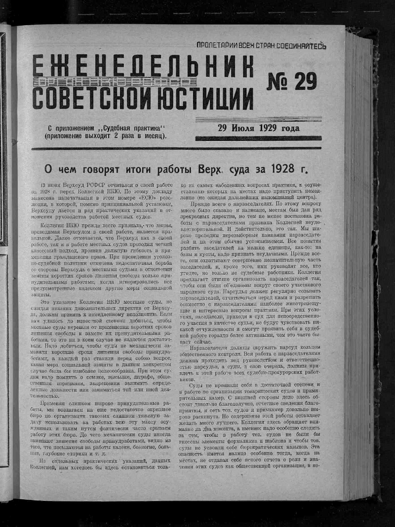 1929, № 29 (29 июля). - 1929. - С. 665-688 : табл. - Содерж.: О чем говорят итоги работы Верхсуда за 28 г. / Нахимсон. Как работал в 1928 г. Верховный суд РСФСР. Постановление коллегии НКЮ по докладу Верхсуда РСФСР за 1928 г. Работники юстиции перед лицом чистки советского аппарата и собственных рядов / Н. Наумов. Прокуратура в социалистическом соревновании / О. Гречихов, и другие материалы. - Библиография в подстрочных примечаниях. - 14500 экз.