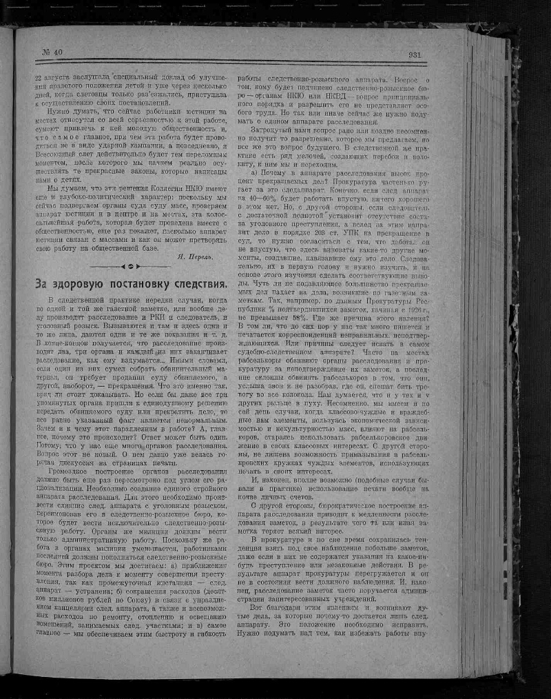 1929, № 40 (17 октября). - 1929. - С. 929-952. - Содерж.: Народный Комиссариат Юстиции и дети / Перель. За здоровую постановку следствия / Н. Общественная работа следователя и дружина по борьбе с преступностью / В. Сарычев. Пути и методы улучшения работы по расследованию газетных заметок / В. Мелкумян. Правовая защита батрачества / Смертюков, и другие материалы. - Библиография в подстрочных примечаниях. - 13500 экз.