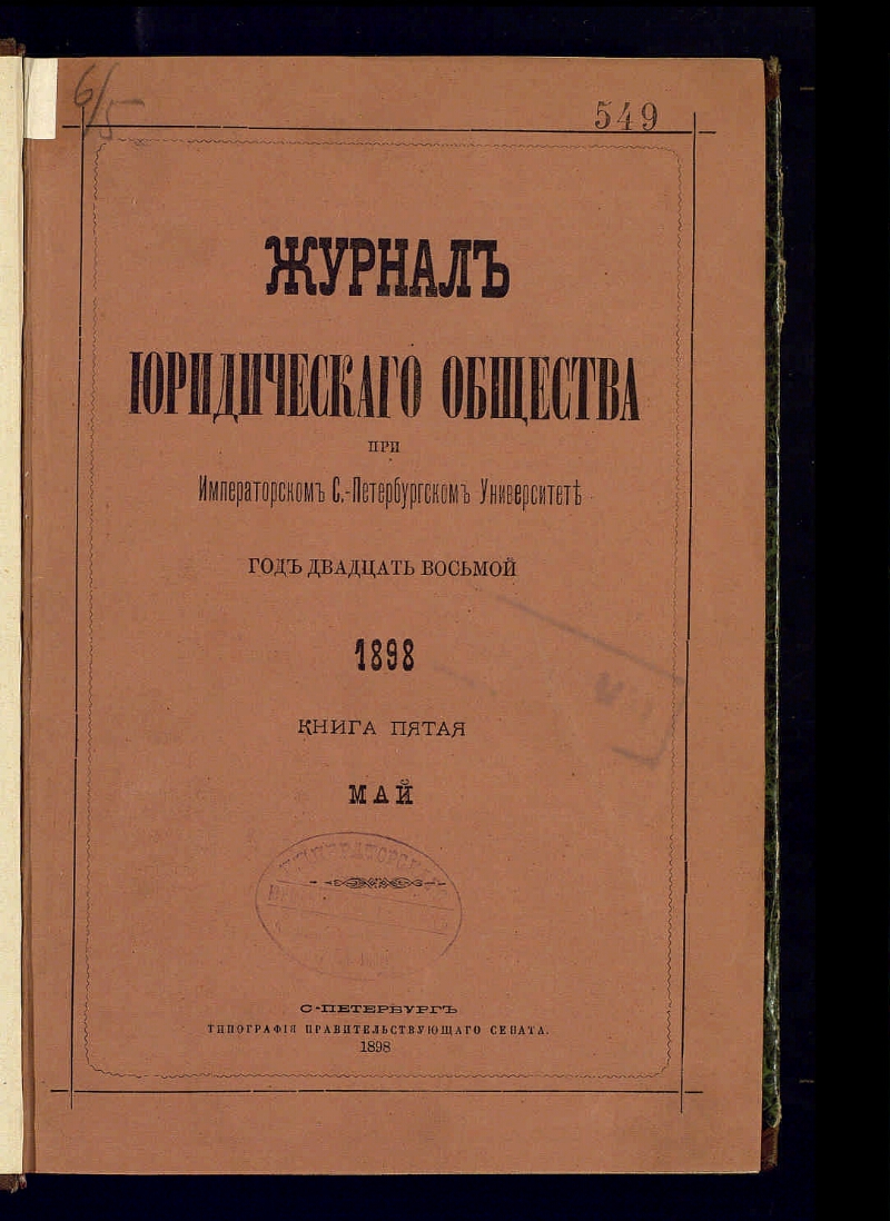 Журнал Юридического общества при Императорском С.-Петербургском университете. - С.-Петербург : Типография Правительствующего Сената, 1894-1898. - Заглавия: 1871-1872 Журнал гражданского и торгового права ; 1873-1894 кн. 1 Журнал гражданского и уголовного права ; 1899-1906 Вестник права