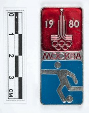 Значок "Москва 1980" : [фотография] / фот. А. Мелентьев. - Электронные данные (1 файл : 3,8 МБ). - Санкт-Петербург : Президентская библиотека имени Б. Н. Ельцина, 2013. - Режим доступа: интернет-портал Президентской библиотеки имени Б. Н. Ельцина. Заглавие на основе анализа объекта. Копирование пользователями не разрешается. На фотографии: сувенирный значок "Москва 1980". Прямоугольник размером 46х20 мм, в верхней части которого на красном фоне эмблема Олимпийских игр – шесть беговых дорожек, вырастающих в символическое высотное здание Москвы, увенчанное пятиконечной звездой, в основании – пять переплетенных олимпийских колец и цифры 1980, в нижней части на синем фоне пиктограмма футбол, в центре надпись: "Москва". Белый металл. Красная, синяя эмали. Штамповка. Крепление булавочное. На оборотной стороне - клеймо завода-изготовителя: "ЛТ" (Научно-производственное объединение "Лентеплоприбор"), цена 27 коп. Местонахождение: Из частного собрания