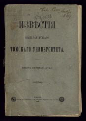 Известия Императорского Томского университета. - Кн. 1-70, Т. 71-. -Томск, 1889-1916. - Загл.: Кн. 1 (1889) - 65 (1916) Известия Императорского Томского университета (на тит. л. кн. 1 - 2: Томские университетские известия ; в Кн. 50 (1913) загл. отсутствует) ; Кн. 66 (1917) - 84 (1929) Известия Томского государственного университета; с Т. 85 (1932) Труды Томского государственного университета (с Т. 87 (1935) ... имени В. В. Куйбышева); Т. 98 (1947) Труды Томского государственного университета им. В. В. Куйбышева и Томского государственного педагогического института ; отд. вып. с 1948 по 1976 гг. вых. под загл.: Труды Томского ордена Трудового Красного Знамени государственного университета им. В. В. Куйбышева (т. 204 (1971) загл. отсутствует); с Т. 266 (1998) - Вестник Томского государственного университета. Редактором издания являлся действующий ректор Университета; отдельные тома разновременно подписывали: проф. А. И. Судаков (1901-1902); проф. М. Г. Курлов (1904-1905, 1907); проф. Ф. К. Крюгер (1908-1909); И. А. Базанов (1911-1912). Издатель: Совет Императорского Томского университета. Внутри выпусков пагинация смешанная, около 374—1574 стр.; содержит карты, таблицы, иллюстрации. В составе «Известий» кн. 21 печатались «Труды Юридического кабинета при Томском университете. Статистико-экономическое отделение», вып. 1. Вых. с 1889 г. В период 1889-1916 гг. вышло 65 томов, в 1917-1929 гг. вышли тома с 66 по 84, в 1932-1976 гг. вышли тома 85-265, в период с 1976 по 1998 гг. журнал не издавался, возобновлен в 1998 г. с тома 266. Содержание Кн. 1-9 1889-1896 в Кн. 10 1896. С. I-VIII.