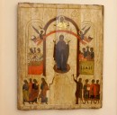 Ч. 12: Покров. Конец XIV в. Из Зверина монастыря : [альбом фотографий]. - Электронные графические данные (11 файлов : 77,1 МБ). - Великий Новгород, 22 мая 2012 года. - Режим доступа: интернет-портал Президентской библиотеки имени Б. Н. Ельцина. Заглавие из сопроводительного документа. Дата съемки: 22.05.2012. В двенадцатую часть альбома включены: обложка-заставка, 10 фотографий иконы "Покров". На фотографиях изображены общий вид и фрагменты иконы. Православный праздник Покрова Богородицы связан с событием из жития Андрея Юродивого, видевшего вместе со своим учеником блаженным Епифанием, Богородицу, распростёршую над собравшимися в храме верующими свой красный плащ - мафорий. Икона, представленная в альбоме - храмовый образ из церкви Покрова Зверина монастыря, написанный около 1399 года. Композицию можно условно разделить на три регистра. В центре нижнего яруса изображены закрытые царские врата, являющиеся прообразом, символом Богородицы из ветхозаветного пророчества Иезекииля о "заключенных" дверях, которыми входит Господь. Слева от врат изображены Иоанн Предтеча и апостолы, справа — указующий Епифанию на Богородицу и покров Андрей Юродивый. В среднем ярусе изображена Богоматерь, сопровождающие ее ангелы и святые. Верхний регистр занимает изображение благословляющего Христа и ангелов, которые держат мафорий (покров) над Богоматерью. - Использованы материалы фильма "Русская икона в собрании Новгородского музея-заповедника" (реж. Дьяконова Т. И., Президентская библиотека им. Б. Н. Ельцина, 2012)