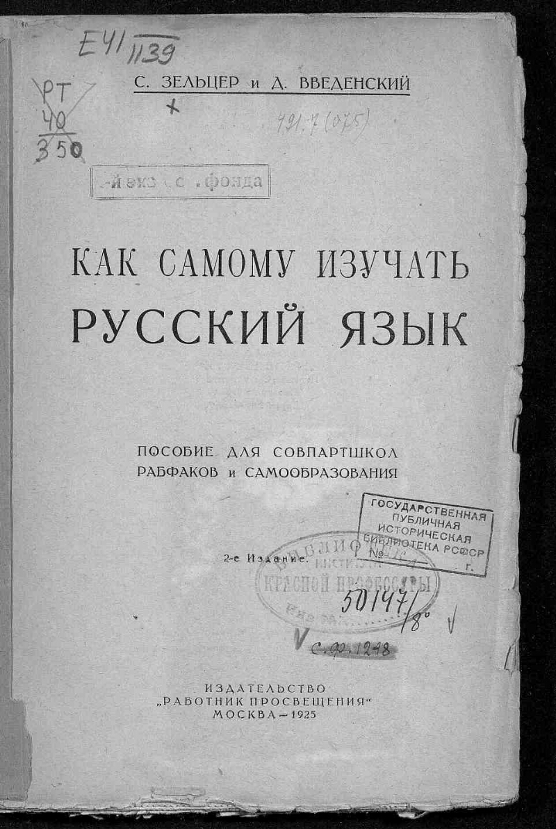 Как самому изучать русский язык : Пособие для совпартшкол, рабфаков и самообразования : Доп. Науч.-пед. секцией Гос. учен. совета / С. Зельцер, Д. Введенский. - 2-е изд. - Москва : Работник просвещения, 1925. - 160 с. : схем., табл. - Библиогр. в тексте. - 10000 экз.