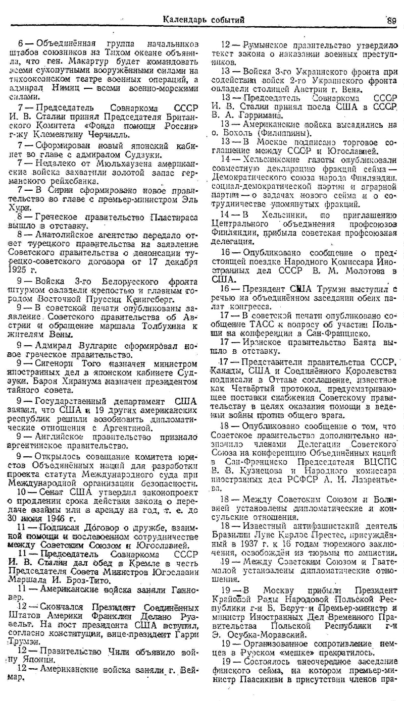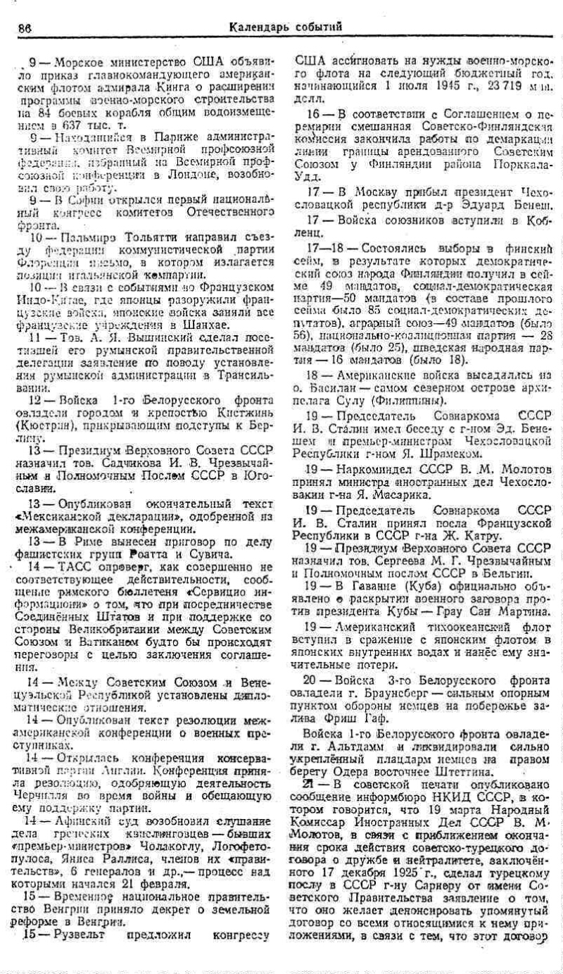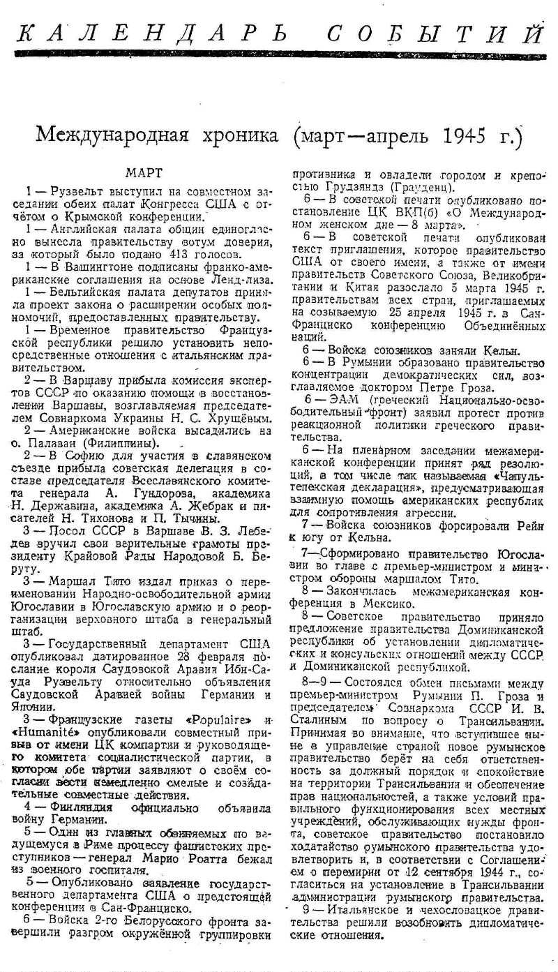 Календарь событий. Международная хроника, (март-апрель 1945 г.)// Мировое хозяйство и мировая политика : ежемесячный журнал / Институт мирового хозяйства и мировой политики Академии наук СССРМосква : Правда , 1924-1947. - № 6 (июнь). - 1945. - С. 85-91
