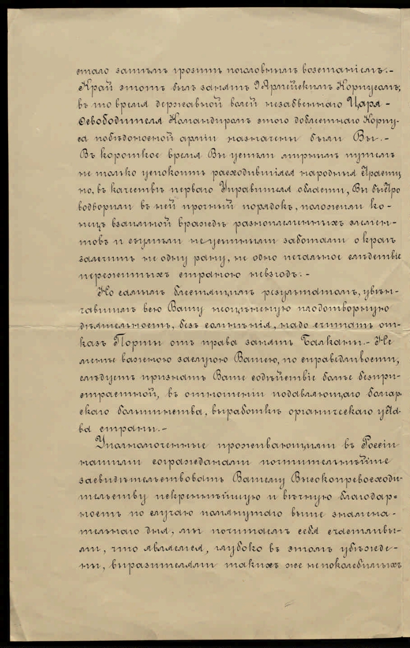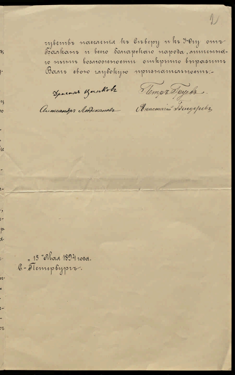 Коллективное письмо уполномоченных проживающими в России болгарами Д. Цанкова, А. Модсканова, П. Груева и А. Бендерова к Столыпину А. Д. с выражением благодарности за умелое управление "Восточной Румелией" (Болгарией) в 1879 году [Дело] : май 1894 г. - 1894. -2 л.. - (Фонд Столыпин Петр Аркадьевич (1862-1911), Министр внутренних дел, Председатель Совета Министров. Опись № 1). - Документы А. Д. Столыпина
