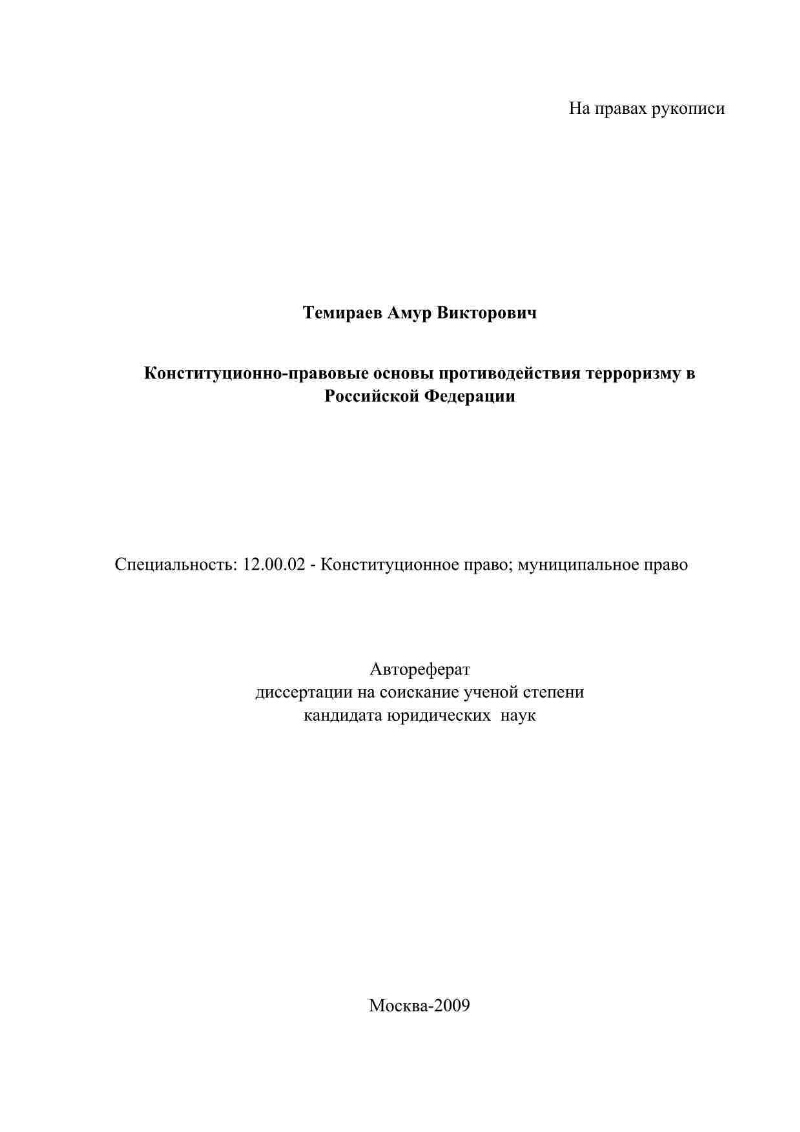 Конституционно-правовые основы противодействия терроризму в Российской Федерации : автореф. дис. на соиск. учен. степ. канд. юрид. наук : специальность 12.00.02 / Темираев Амур Викторович ; [Рос. акад. правосудия]. - Москва, 2009. - 26 с. ; 21. - Библиогр.: с. 25-26 (5 назв.). - 150 экз.