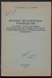 Краткое практическое руководство по приему, уходу и хранению продовольственных овощей и картофеля в специализированных и приспособленных помещениях : [практическое руководство] / В. Н. Гиренко, В. С. Киселев ; Лензаготплодоовощторг. - [Ленинград] : Ленинградское газетно-журнальное и книжное издательство, 1943. - 58, [2] с. ; 21 см