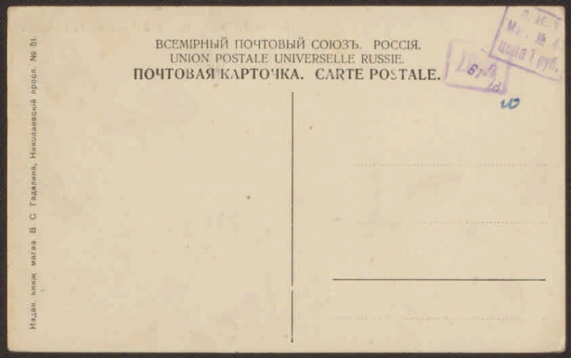 I. Президентская библиотека им. Б. Н. Ельцина (Санкт-Петербург). II. Всемирный почтовый союз.1. Открытки в фонде Президентской библиотеки (коллекция). 2. Территория (коллекция). 3. Территория России: Санкт-Петербург, город (коллекция). 4. Кронштадт – город морской славы России (коллекция). 5. История образования в России (коллекция). 6. Итальянский дворец (Кронштадт, город; Санкт-Петербург, город) -- Открытки. 7. Документальные открытки -- Россия -- 1909-1917. |