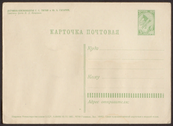 Летчики-космонавты Г. С. Титов и Ю. А. Гагарин [Изоматериал : электронный ресурс] : [открытка] / цветное фото В. Д. Киврина. - Электронные данные (2 файла : 1,2 МБ). -(Санкт-Петербург: Президентская библиотека имени Б. Н. Ельцина , 2015). - Режим доступа: интернет-портал Президентской библиотеки имени Б. Н. Ельцина. Заглавие с экрана. Электронная репродукция почтовой карточки: Летчики-космонавты Г. С. Титов и Ю. А. Гагарин [Изоматериал] / цветное фото В. Д. Киврина. [Москва] : издание Министерства связи СССР, 1961. 1 открытка : цветной офсет. А 09066, 4 коп. Местонахождение: Детский музей открытки, Санкт-Петербург. Копирование пользователями не разрешается.