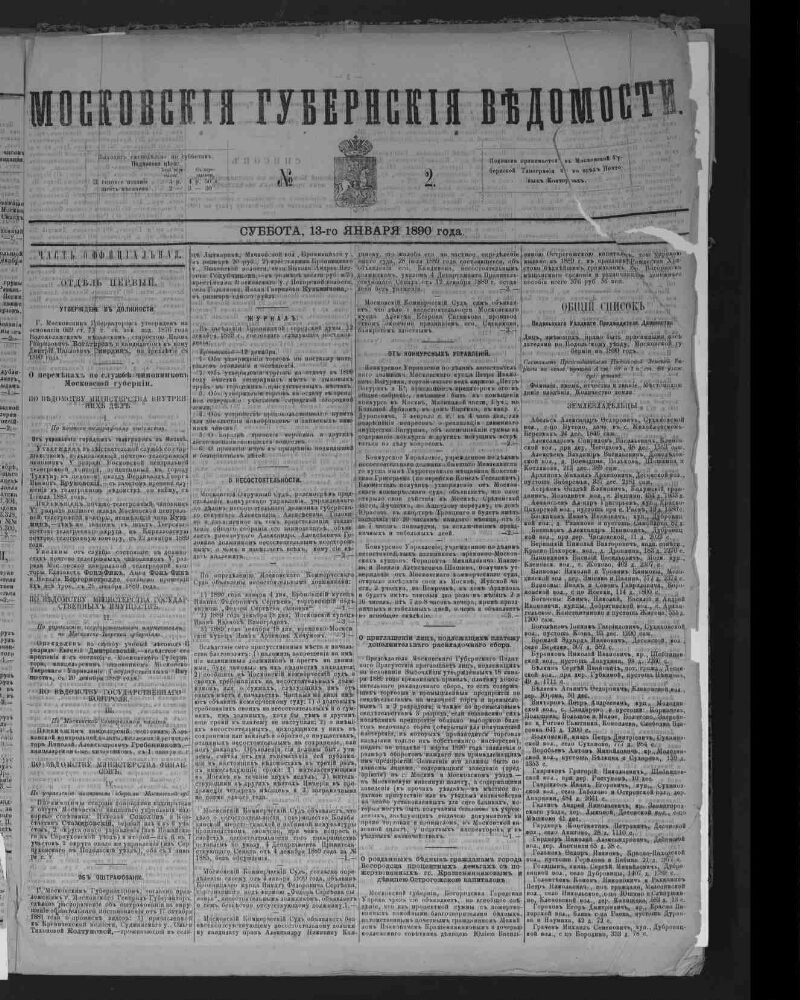 1890, № 2 (13 января). - 1890. - 4 с. - Копия экземпляра Президентской библиотеки неполная: отсутствует "Прибавление к № 2-му Московских Губернских Ведомостей Официальной части. По Империи. Лист 1" (4 с.)