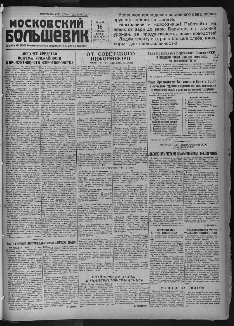 Московский большевик : орган МК и МГК ВКП(б), Московского областного и городского Советов депутатов трудящихся. - 1918, № 1 (18 июля) -. - Москва, 1939-1950. - Издается с 18 июля 1918 г. Первый номер газеты вышел под названием "Вечерние Известия Московского Совета Рабочих и Красноармейских депутатов". С 18 марта 1920 г. газета выходит под названием "Коммунистический труд" - орган Московского комитета РКП и Московского совета. С 7 февраля 1922 г. - "Рабочая Москва», с 1 марта 1939 г. - "Московский большевик". С 19 февраля 1950 г. газета выходит под названием "Московская правда". Главный (ответственный) редактор в 1941-1945 гг. - К. А. Губин, в 1986-1988 гг. - Михаил Полторанин, с августа 1991 г. - Шод Саидович Муладжанов. С 1992 г. выходят специализированные приложения к газете ("Мегаполис", "Управа", "Московская перспектива", "Мое поколение", "Спортивная столица", "Зазеркалье", "Московская старина" и др.)