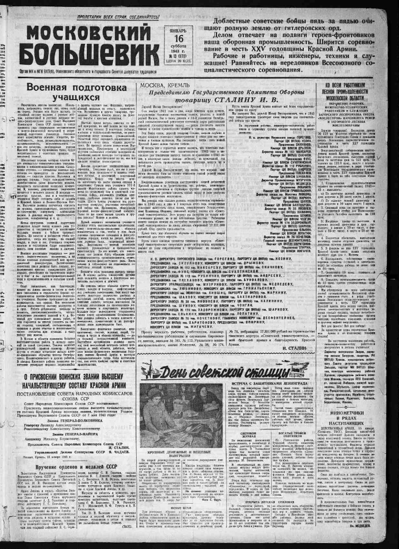 Московский большевик : орган МК и МГК ВКП(б), Московского областного и городского Советов депутатов трудящихся. - 1918, № 1 (18 июля) -. - Москва, 1939-1950. - Издается с 18 июля 1918 г. Первый номер газеты вышел под названием "Вечерние Известия Московского Совета Рабочих и Красноармейских депутатов". С 18 марта 1920 г. газета выходит под названием "Коммунистический труд" - орган Московского комитета РКП и Московского совета. С 7 февраля 1922 г. - "Рабочая Москва», с 1 марта 1939 г. - "Московский большевик". С 19 февраля 1950 г. газета выходит под названием "Московская правда". Главный (ответственный) редактор в 1941-1945 гг. - К. А. Губин, в 1986-1988 гг. - Михаил Полторанин, с августа 1991 г. - Шод Саидович Муладжанов. С 1992 г. выходят специализированные приложения к газете ("Мегаполис", "Управа", "Московская перспектива", "Мое поколение", "Спортивная столица", "Зазеркалье", "Московская старина" и др.)