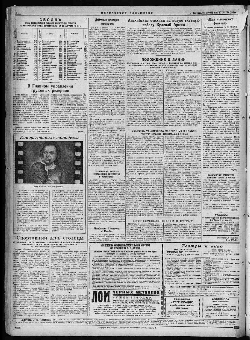 Московский большевик : орган МК и МГК ВКП(б), Московского областного и городского Советов депутатов трудящихся. - 1918, № 1 (18 июля) -. - Москва, 1939-1950. - Издается с 18 июля 1918 г. Первый номер газеты вышел под названием "Вечерние Известия Московского Совета Рабочих и Красноармейских депутатов". С 18 марта 1920 г. газета выходит под названием "Коммунистический труд" - орган Московского комитета РКП и Московского совета. С 7 февраля 1922 г. - "Рабочая Москва», с 1 марта 1939 г. - "Московский большевик". С 19 февраля 1950 г. газета выходит под названием "Московская правда". Главный (ответственный) редактор в 1941-1945 гг. - К. А. Губин, в 1986-1988 гг. - Михаил Полторанин, с августа 1991 г. - Шод Саидович Муладжанов. С 1992 г. выходят специализированные приложения к газете ("Мегаполис", "Управа", "Московская перспектива", "Мое поколение", "Спортивная столица", "Зазеркалье", "Московская старина" и др.)