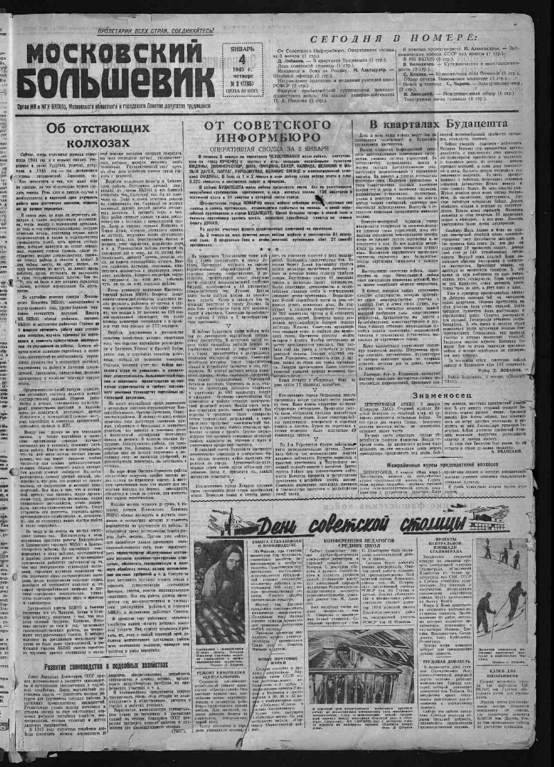 Московский большевик : орган МК и МГК ВКП(б), Московского областного и городского Советов депутатов трудящихся. - 1918, № 1 (18 июля) -. - Москва, 1939-1950. - Издается с 18 июля 1918 г. Первый номер газеты вышел под названием "Вечерние Известия Московского Совета Рабочих и Красноармейских депутатов". С 18 марта 1920 г. газета выходит под названием "Коммунистический труд" - орган Московского комитета РКП и Московского совета. С 7 февраля 1922 г. - "Рабочая Москва», с 1 марта 1939 г. - "Московский большевик". С 19 февраля 1950 г. газета выходит под названием "Московская правда". Главный (ответственный) редактор в 1941-1945 гг. - К. А. Губин, в 1986-1988 гг. - Михаил Полторанин, с августа 1991 г. - Шод Саидович Муладжанов. С 1992 г. выходят специализированные приложения к газете ("Мегаполис", "Управа", "Московская перспектива", "Мое поколение", "Спортивная столица", "Зазеркалье", "Московская старина" и др.)