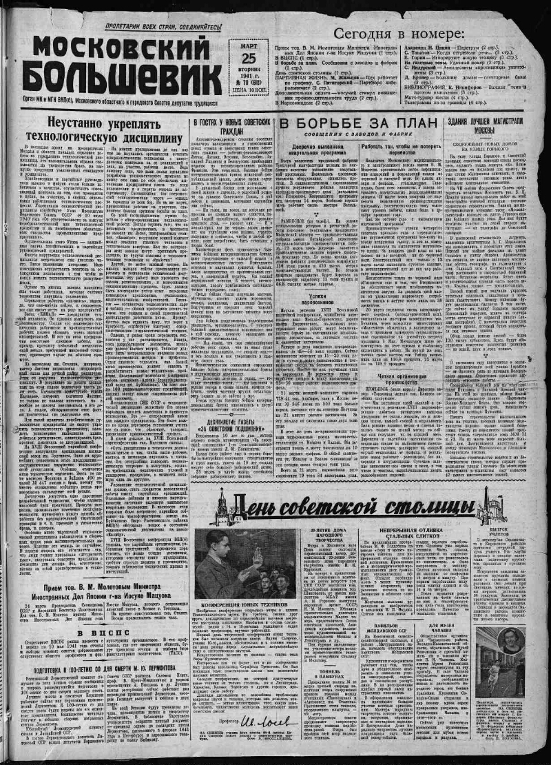 Московский большевик : орган МК и МГК ВКП(б), Московского областного и городского Советов депутатов трудящихся. - 1918, № 1 (18 июля) -. - Москва, 1939-1950. - Издается с 18 июля 1918 г. Первый номер газеты вышел под названием "Вечерние Известия Московского Совета Рабочих и Красноармейских депутатов". С 18 марта 1920 г. газета выходит под названием "Коммунистический труд" - орган Московского комитета РКП и Московского совета. С 7 февраля 1922 г. - "Рабочая Москва», с 1 марта 1939 г. - "Московский большевик". С 19 февраля 1950 г. газета выходит под названием "Московская правда". Главный (ответственный) редактор в 1941-1945 гг. - К. А. Губин, в 1986-1988 гг. - Михаил Полторанин, с августа 1991 г. - Шод Саидович Муладжанов. С 1992 г. выходят специализированные приложения к газете ("Мегаполис", "Управа", "Московская перспектива", "Мое поколение", "Спортивная столица", "Зазеркалье", "Московская старина" и др.)