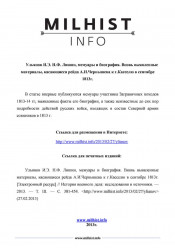 Н. Ф. Лишин, мемуары и биография. Вновь выявленные материалы, касающиеся рейда А. И. Чернышева к г. Касселю в сентябре 1813 г. [Текст : электронный ресурс] / Ульянов И. Э. - Электронные данные (75 файлов : 85,3 МБ). - (Санкт-Петербург: Президентская библиотека имени Б.Н. Ельцина , 2013). - Режим доступа: интернет-портал Президентской библиотеки имени Б. Н. Ельцина. Заглавие с экрана. Оригинальный ресурс опубликован в электронном периодическом издании: История военного дела: исследования и источники (http://www.milhist.info/). Т. 3: Октябрь 2012 - март 2013. – 2012-2013. – С. 381-454 : ил., цв. ил. – Библиография: с. 451-454. В статье впервые публикуются мемуары полковника Н. Ф. Лишина, как источник по изучению одного из эпизодов Заграничных походов 1813-14 гг. - похода отряда генерал-адъютанта А. И. Чернышева к г. Кассель в сентябре 1813 года