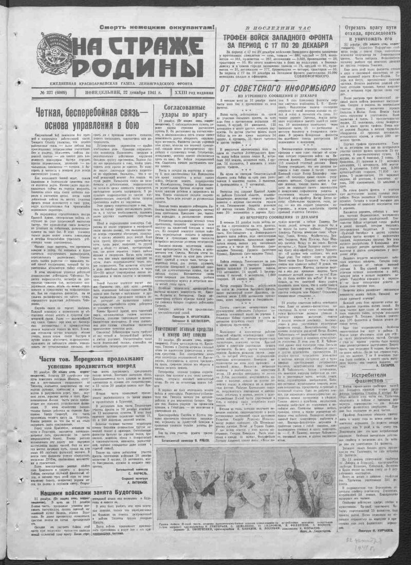 1941, № 327 (6009) (22 декабря). - 1941. - 2 c.