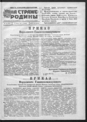 На страже Родины : газета Ленинградского военного округа. - 1918, 1 мая -. - Ленинград, 1938-. - Заглавие: 1918-1921 Красная Армия, Вооруженный народ, Боевая правда ; 1921-1938 Красная звезда. Подзаг.: 1941 г. - ежедневная красноармейская газета Ленинградского военного округа ; 1945 г. - ежедневная красноармейская газета Ленинградского фронта. Ответственный редактор: 1945 г. - М. Гордон. Адрес: 1945 г. - Полевая почта 22245 А. Первый номер газеты «На страже Родины» вышел 1 мая 1918 года под названием «Красная Армия». Позднее газета выходила под разными названиями: «Вооруженный народ», «Боевая правда», а с 10 ноября 1921 года - «Красная звезда», как печатный орган Петроградского военного округа. Название «На страже Родины» появляется с 4 февраля 1938 года, когда газета становится органом Ленинградского военного округа. 7 апреля 1940 года газета «На страже Родины» первой из окружных газет была удостоена высокой награды – ордена Красного Знамени. На ее страницах печатались фельетоны о солдатских буднях во время советско-финской войны 1939-1940 гг., подписанные псевдонимом Вася Теркин – персонажем, созданным членами редколлегии газеты в составе А. Твардовского, Н. Тихонова, С. Вашенцева, В. Саянова и др. С началом Великой Отечественной войны окружная газета стала фронтовой. С ноября 2010 года - печатный орган Западного военного округа газета «На страже Родины», выходит в качестве региональной вкладки к центральному изданию Министерства обороны Российской Федерации газете «Красная Звезда». Периодичность выхода 1 раз в неделю, по субботам