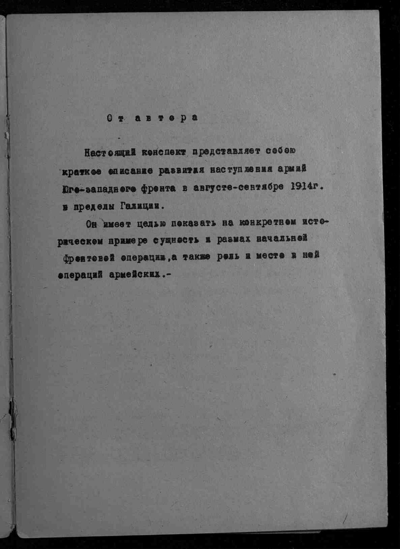 Наступление русских армий Юго-западного фронта в пределы Галиции и поражение австро-венгерцев в 1914 г. : (конспект) / полковник М. Савин ; Военная академия механизации и моторизации РККА им. Сталина. Кафедра военной истории. Командный факультет 3 курс. 1938/39 уч. год. - Москва : издание Академии, 1938. - 32 с. : схем., табл. - На правах рукописи. . - 150 экз.