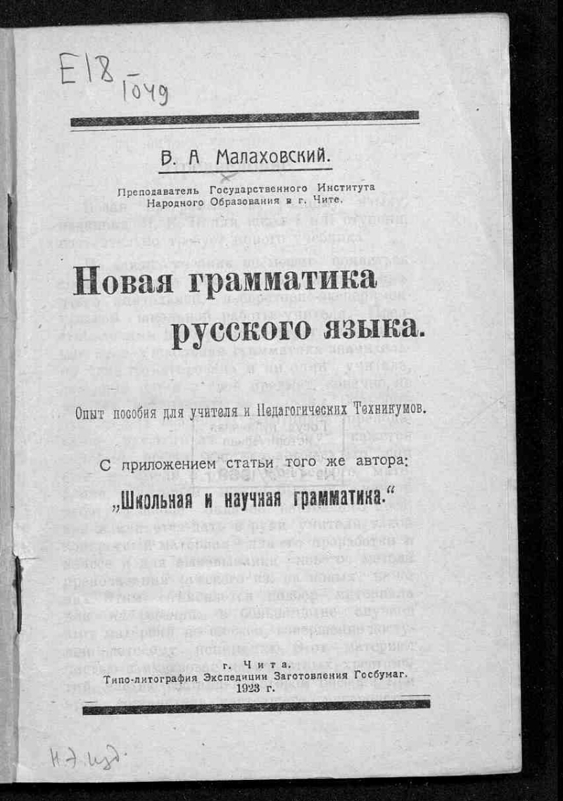 Новая грамматика русского языка : Опыт пособия для учителя и пед. техникумов : С прил. статьи того же автора: "Школьная и научная грамматика" / В.А. Малаховский, преп. Гос. ин-та нар. образования в г. Чите. - Чита : Типо-лит. Экспедиции загот. госбумаг, 1923. -152 с. : ил.. - Указатель: с. 150. - Библиогр. в подстроч. примеч.