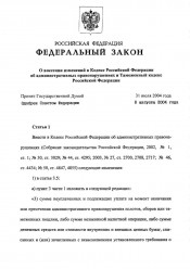 О внесении изменений в Кодекс Российской Федерации об административных правонарушениях и Таможенный кодекс Российской Федерации : Федеральный закон от 20 августа 2004 года № 118-ФЗ : принят Государственной Думой 31 июля 2004 года : одобрен Советом Федерации 8 августа 2004 года. - Москва, 2004. - 35 листов. - Перед текстом: Российская Федерация. В конце текста подпись: Президент Российской Федерации В. Путин. Место и дата подписания: Москва, Кремль 20 августа 2004 года. Электронная версия нормативно-правого акта (35 файлов, 300 dpi, JPEG, 37,5 МБ). Действует с изменениями - в редакции Федеральных законов от 27.11.2010 г. № 311-ФЗ ; от 12.11.2012 г. № 194-ФЗ. - Опубликован в изданиях: Собрание законодательства Российской Федерации от 2004 г., № 34, ст. 3533 ; "Российская газета" от 25.08.2004 г. (№ 182) ; "Парламентская газета" от 25.08.2004 г. (№ 155-156)