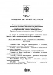 О награждении государственными наградами Российской Федерации работников государственного унитарного предприятия города Москвы "Московский ордена Ленина и ордена Трудового Красного Знамени метрополитен имени В. И. Ленина" : Указ Президента Российской Федерации от 8 мая 2010 года № 562. - Электрон. текстовые дан. (3 файла). -(Москва: , 2010). -3 л.. - Электронная копия. - Текстовое (символьное) электронное издание. За заслуги в развитии транспортного комплекса города Москвы и многолетний добросовестный труд наградить ... ; Присвоить почетное звание ...