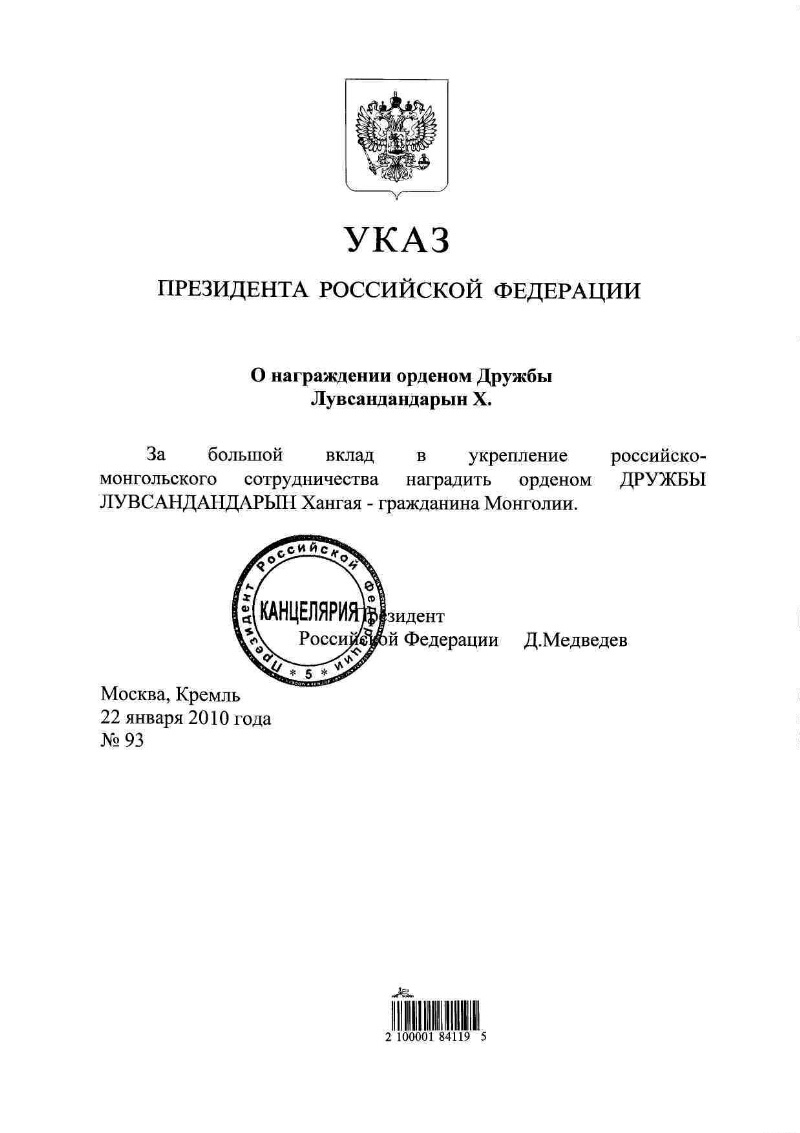 О награждении орденом Дружбы Лувсандандарын Х. : Указ Президента Российской Федерации от 22 января 2010 года № 93. - Москва, 2010. - 1 л. - Электронная копия .
