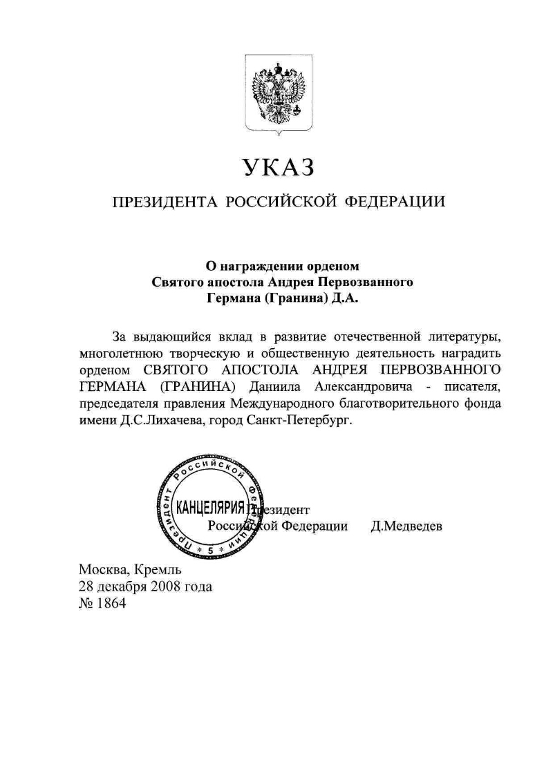 О награждении орденом Святого апостола Андрея Первозванного Германа (Гранина) Д.А. : Указ Президента Российской Федерации от 28 декабря 2008 года № 1864. - Москва, 2008. -1 л.. - Электронная копия.