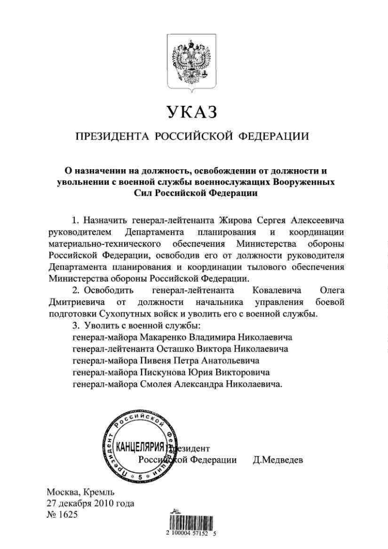 О назначении на должность, освобождении от должности и увольнении с военной службы военнослужащих Вооруженных Сил Российской Федерации : Указ Президента Российской Федерации от 27 декабря 2010 года № 1625. - Электрон. текстовые дан. (1 файл). - (Москва: , 2010). - 1 л. - Электронная копия. - Текстовое (символьное) электронное издание