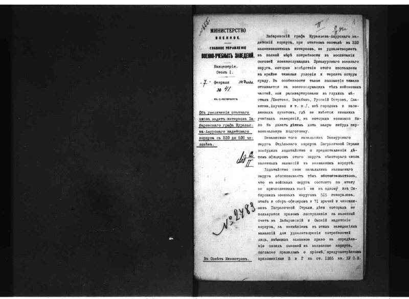 Об увеличении числа воспитанников в Хабаровском кадетском корпусе гр. Муравьева-Амурского [Дело] : 11 февраля - 1 апреля. - 1913. - 44 л.. - (Фонд Совета министров (1905-1917). Опись № 9. 1913 г.). - Заголовок на папке: Об увеличении штатного числа кадет-интернов Хабаровского графа Муравьева-Амурского кадетского корпуса. Наука и образование