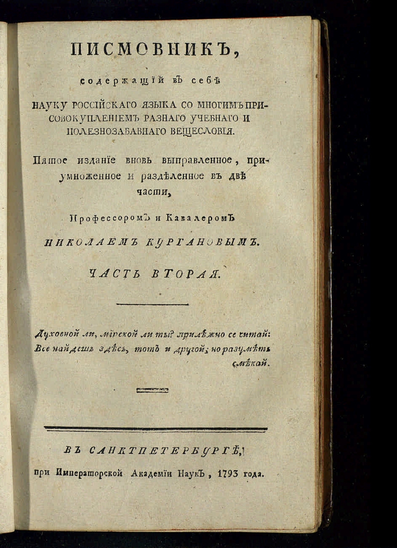 Писмовник, : Содержащий в себе науку российскаго языка : Со многим присовокуплением разнаго учебнаго и полезнозабавнаго вещесловия. - Пятое издание / Вновь выправленное, приумноженное и разделенное в две части профессором и кавалером Николаем Кургановым. - В Санктпетербурге : при Императорской Академии наук, 1793. - 8°. -