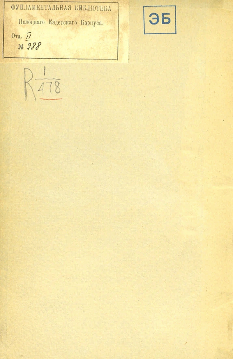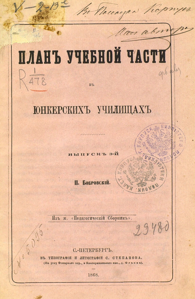 Автор Бобровский Павел Осипович Описание Бобровский, Павел Осипович (1832-1905). План учебной части в юнкерских училищах/ П. Бобровский . - С.-Петербург : тип. и лит. С. Степанова , 1867-1868 . - 23 см Вып. 3. - 1868. - 59 с. . ББК 68.439.8(2) Источник копии: РГБМесто хранения оригинала: РГБ Издательство в типографии и литографии С. Степанова Объект в каталогах Вооруженные силы в целом В коллекциях Государственные праздники России: история и современность → День Героев Отечества – 9 декабря → История праздника → Защита Отечества: на фронте и в тылу → Вооружённые силы → Коллекции → Русская императорская армия → Военно-учебные заведения → Юнкерские училища
