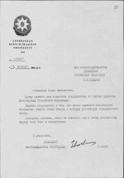 Поздравление в адрес Президента Российской Федерации в связи с принятием Конституции Российской Федерации Президента Азербайджанской Республики Гейдара Алиева [Документ] : 27 декабря 1993 г. - 1993. -Л. 50. - (Архив Президента Российской Федерации. Ф. 91. Опись 1 ; Д. 507). - Машинописный текст. Электронная версия (1 файл, 300 dpi, JPEG, 3,4 МБ). Архив Президента Российской Федерации. Поздравление Президента Азербайджанской Республики Его Превосходительству Президенту Российской Федерации Б. Н. Ельцину по случаю принятия Конституции Российской Федерации. 27 декабря 1993 года. № 1/1407. В конце текста собственноручная подпись: Президент Азербайджанской Республики Г. Алиев. На официальном бланке